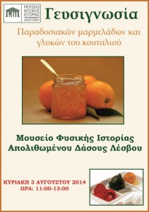 Ένα γευστικό καλωσόρισμα έχει οργανωθεί για αυτή την Κυριακή 3 Αυγούστου και ώρα 11:00 – 13:00 για τους επισκέπτες του Μουσείου Φυσικής Ιστορίας Απολιθωμένου Δάσους Λέσβου. Γευστικές δοκιμές παραδοσιακών λεσβιακών γλυκών του κουταλιού και μαρμελάδων που παρασκευάζουν οι Γυναικείοι Αγροτουριστικοί Συνεταιρισμοί της Λέσβου θα προσφερθούν σε όλους τους συμμετέχοντες της εκδήλωσης. Στόχος του Μουσείου είναι μέσα από τις εκδηλώσεις γευσιγνωσίας όλοι οι επισκέπτες της Γιορτής Αγροτουρισμού φεύγοντας να πάρουν μαζί τους μια γεύση της Λέσβου.