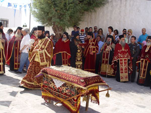Ο χρυσοποίκιλτος επιτάφιος της Παναγίας περιφέρεται στα σοκάκια του νησιού σε μεγαλοπρεπή πομπή, ενώ οι καμπάνες του μοναστηριού και των άλλων εκκλησιών ηχούν ασταμάτητα.