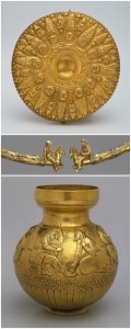 Στη φωτογραφία από πάνω προς τα κάτω: Χρυσή ομφαλωτή φιάλη με ανάγλυφα κεφάλια Μεδουσών, Σκυθών με οξυκόρυφα καπέλα και ζώων. Από τον σκυθικό βασιλικό τύμβο Kul Oba στην Κριμαία. 4ος αι. π.Χ. – Λεπτομέρεια από το χρυσό περιδέραιο τα άκρα του οποίου απολήγουν σε μορφές Σκυθών ιππέων. Από τον σκυθικό βασιλικό τύμβο Kul Oba στην Κριμαία. 4ος αι. π.Χ. – Χρυσό αγγείο με τις ανάγλυφες σκηνές Σκυθών πολεμιστών. Από τον σκυθικό βασιλικό τύμβο Kul Oba στην Κριμαία. 4ος αι. π.Χ.