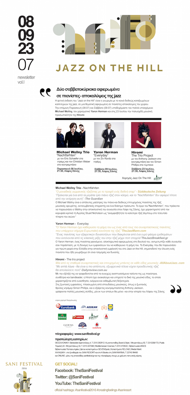 “In balance with the previous festivals, the artistic scheduling of Sani Festival 2016 continues to focus on jazz, classical music and Greek ‘entechni’ (artistic) music, which have stamped a specific mark upon the institution.