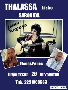 Τη Παρασκευή 26 Αυγούστου, αποχαιρετάμε το φετινό Αυγουστιάτικο καλοκαιράκι στο γνωστό σε όλους μας πια Τhalassa Bistro παρέα με τη Janet Kapuya, σε Latin τραγούδια και χορό και αγαπημένα ελληνικά. Συμμετέχουν η Έλενα Περβαινά και ο Πάνος Δέρβος.